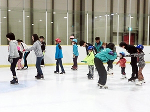 小さなお子さんには補助用具を使って氷上に慣れる練習も。
