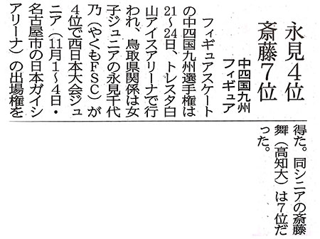 「中四国九州フィギュアスケート選手権」が、9月21日~24日まで、香川県木田郡のトレスタ白山アイスアリーナで開催され、鳥取県からは、シニア女子に齋藤舞選手(高知大学)とジュニア女子に永見千代乃選手(米子北斗高校 / やくもFSC)が出場しました。