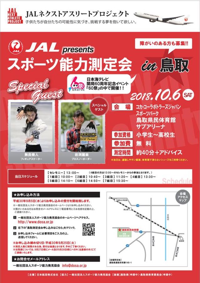 2018年10月6日に鳥取市のコカ・コーラボトラーズジャパンスポーツパーク(鳥取県立布勢総合運動公園)にて開催される、日本海テレビ開局60周年記念イベント『60祭』内の「JAL presents スポーツ能力測定会 in 鳥取」(鳥取県民体育館サブアリーナ)に、スペシャルゲストとして鳥取県スケート連盟登録のプロフィギュアスケーター無良崇人氏、プロスノーボーダー岩渕麗楽さんの出演が決定しました。