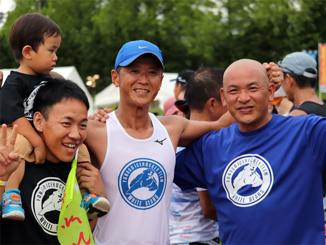 平均年齢40歳を超えるアイスホッケーチームが挑んだのは、水泳3㎞・自転車140㎞・マラソン42.195㎞を各種1名・3人がリレー形式で、総勢60組の参加チームと競う「リレーの部」。