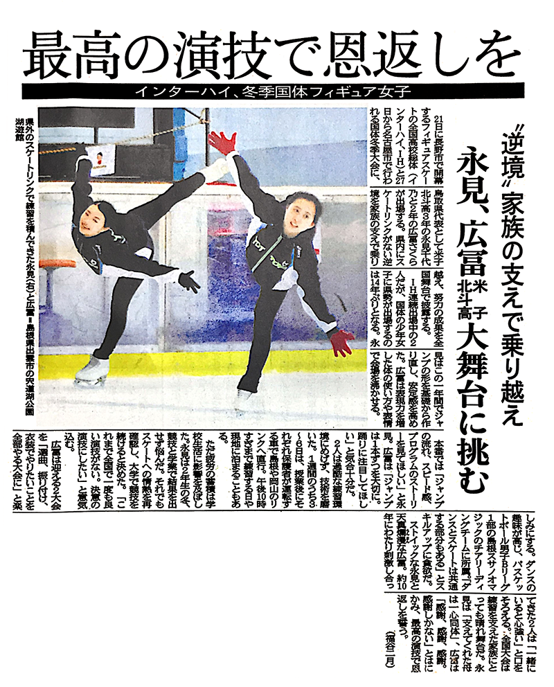インターバルも数日しか無いという日程でしたが、国体という大舞台でも堂々とした演技を見せた2人の活躍は、地元の日本海新聞でもカラー写真入りで大きく掲載されました。