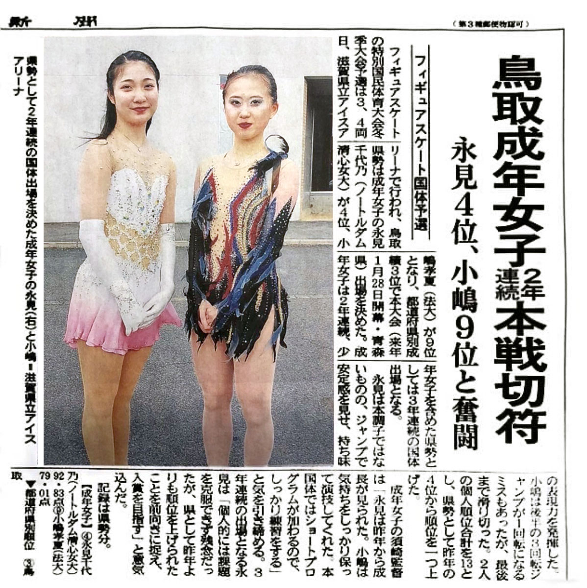 - 【競技結果】鳥取県成年女子 国スポ本戦出場決定:2025年11月29日~11月30日 第80回国民スポーツ大会冬季大会フィギュア競技予選会 / 鳥取県 2位(小嶋4位・永見7位)