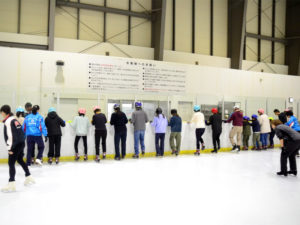 まずはスケート靴の正しい履き方を習い、ヘルメットを装着~準備運動が終わったら、壁を伝いながらゆっくりとリンク内に入ります。