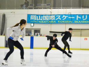 「岡山国際スケートリンク 」を貸し切ってのプロインストラクターによるス ケート教室は、個人のレベルによって、3つのグループ別け(1、全く滑れないグループ / 2、壁に触らずに滑れるグループ / 3、バックで滑れるグループ)によるレッスンです。