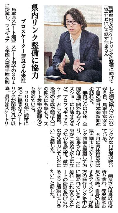 父の無良隆志コーチが鳥取出身であり、鳥取と縁が深いことから鳥取県スケート連盟登録選手となったフィギュアスケーターの無良崇人選手が、鳥取県や鳥取市にスケートリンク要望を伝えてくださった事で、メディアでも扱われるようになり、県内でのスケートリンク問題の認知度も高まりました。