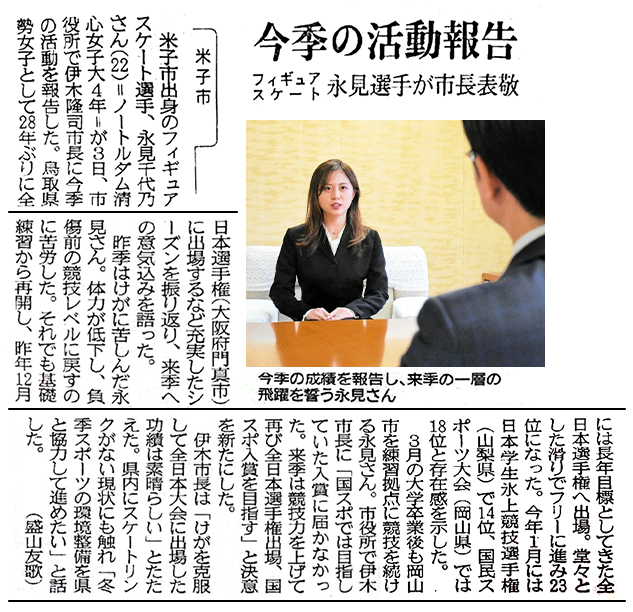 【メディア情報】永見千代乃 記事:2025年2月6日 日本海新聞「今季の活動報告 フィギュアスケート 永見選手が市長表敬」