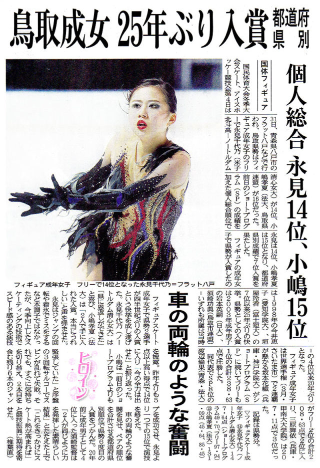 鳥取県からスケートリンクが無くなってから17年…、あきらめることなく県外のスケートリンクで練習を重ね、ついにフィギュア成年女子(永見千代乃・小嶋孝夏チーム)が鳥取県勢として25年ぶりとなる国体入賞。(鳥取県にとって20年ぶり)